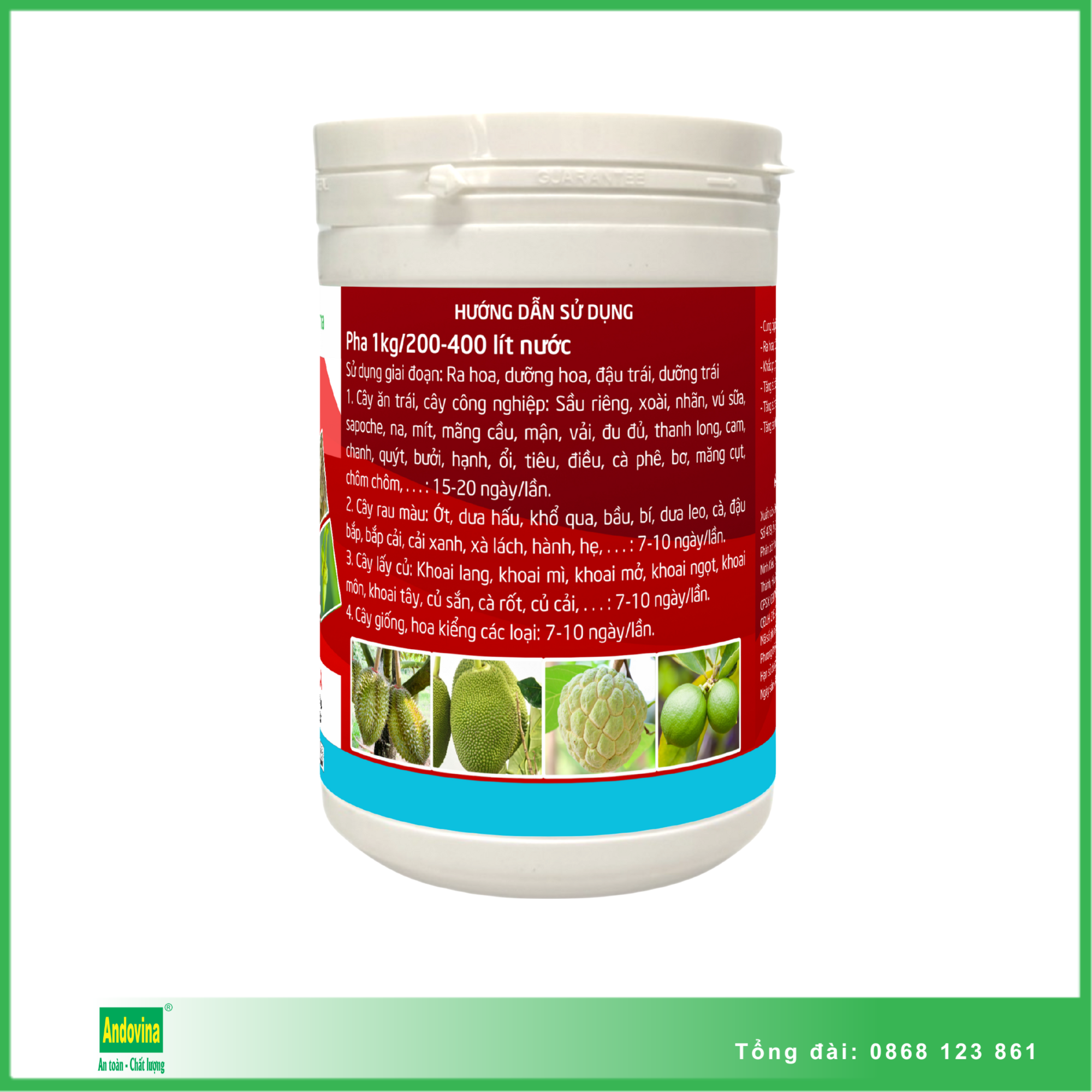 5.1 Cây ăn trái, cây công nghiệp: Sầu riêng, xoài, nhãn, vú sữa, sapoche, na, mít, mãng cầu, mận, vải, đu đủ, thanh long, cam, chanh, quýt, bưởi, hạnh, ổi, tiêu, điều, cà phê, bơ, măng cụt, chôm chôm,... 15-20 ngày/lần.